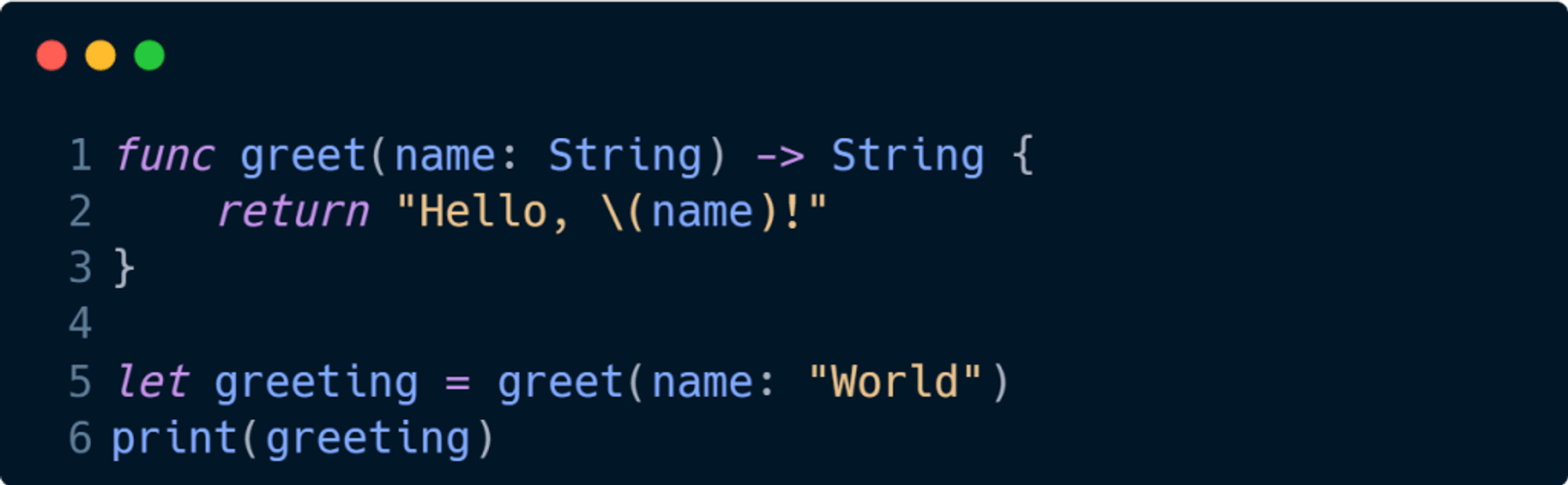 Bu örnekte, Swift'te bir fonksiyonun nasıl tanımlandığını ve kullanıldığını görüyoruz. greet fonksiyonu, verilen bir ismi alır ve bir selamlamayı döner.