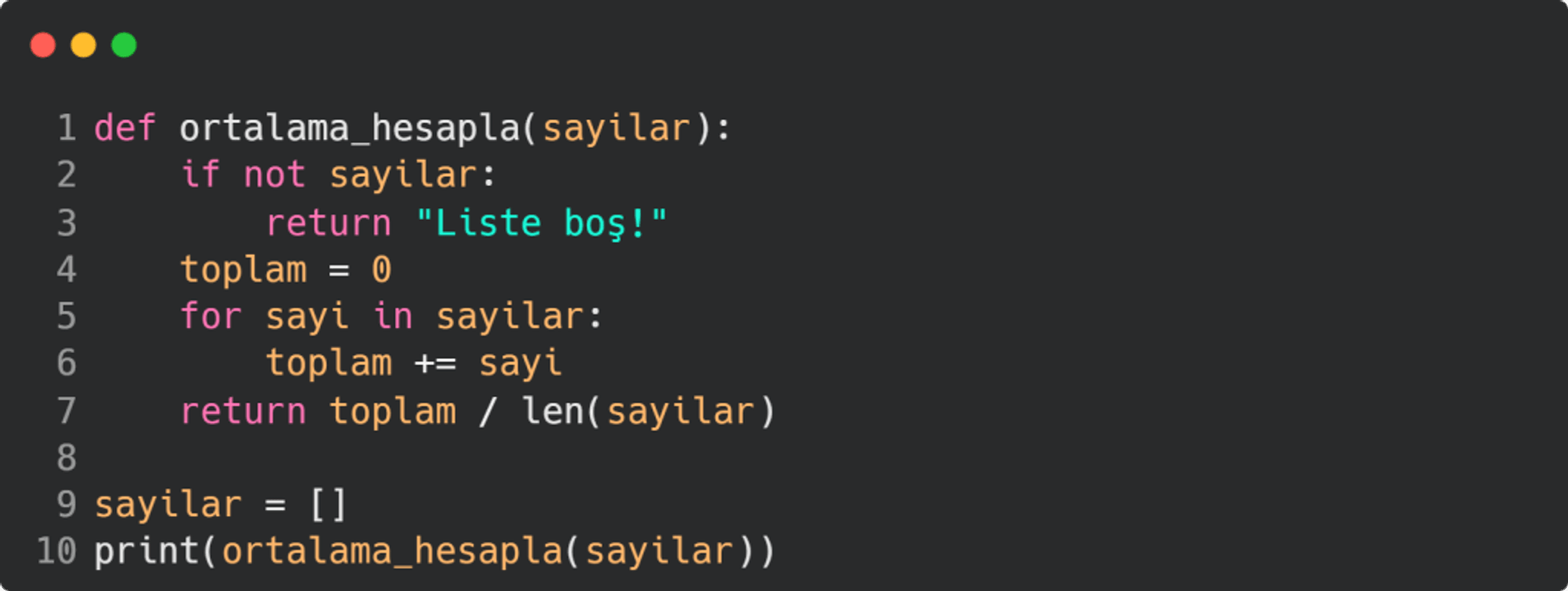 Yukarıdaki kod, verilen sayıların ortalamasını hesaplamak için yazılmıştır. Ancak, eğer sayilar listesi boşsa, len(sayilar) sıfır olacağı için sıfıra bölme hatası oluşacaktır. Bu mantık hatasını önlemek için, liste boşsa uygun bir mesaj döndürmek gereklidir.