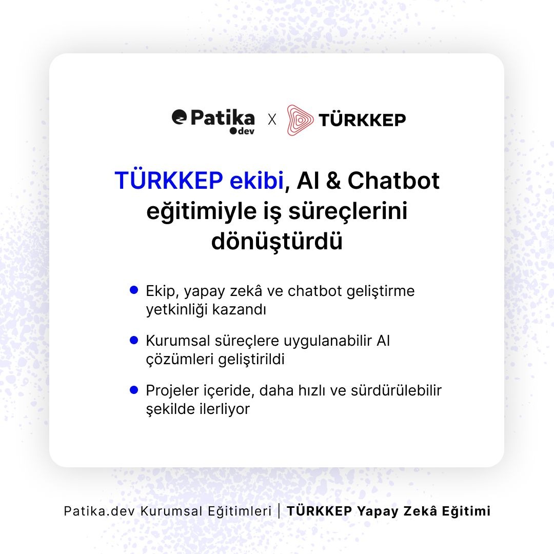 Türkiye’nin lider Kayıtlı Elektronik Posta (KEP) ve dijital dönüşüm çözümleri sağlayıcısı TÜRKKEP, çalışanlarının yapay zekâ ve ileri teknoloji alanındaki yetkinliklerini geliştirmek amacıyla önemli bir adım attı. Patika.dev iş birliğiyle hayata geçirilen, toplam 85 saatlik kapsamlı AI eğitim programı başarıyla tamamlandı.