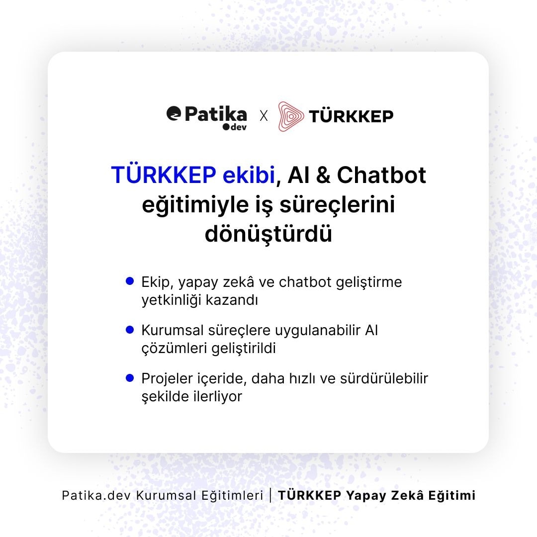 TÜRKKEP, Patika.dev iş birliğiyle 85 saatlik kapsamlı AI eğitim programını başarıyla tamamladı. Farkındalık, teknik derinleşme ve endüstriyel uygulamalar olmak üzere üç aşamada tasarlanan program ile çalışanlar yapay zekâ çözümlerini iş süreçlerine entegre edebilecek donanıma ulaştı.