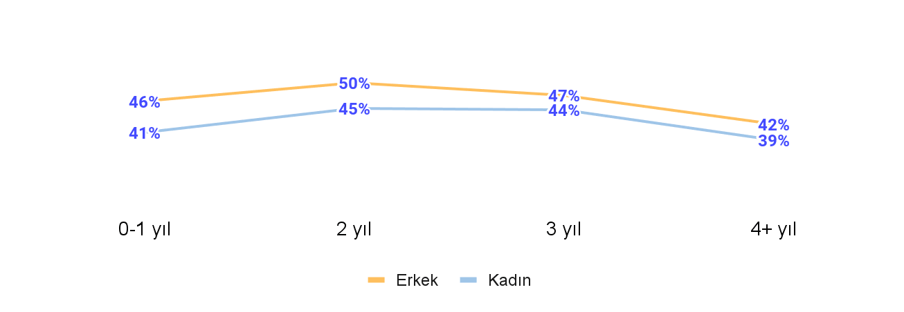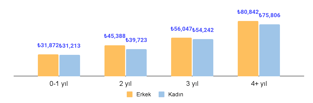 Erkek katılımcılarımız kadın katılımcılarımıza göre %10 daha fazla maaşa ve %4 daha fazla zam oranına sahip. Bu fark tecrübe seviyesi ve pozisyonlara göre ayrıştırarak baktığımızda da kapanmadı.