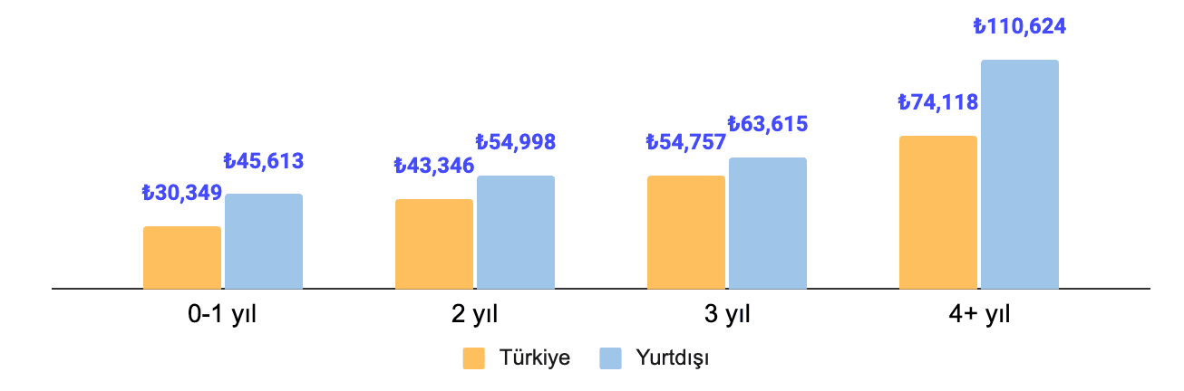 Lokasyona göre zam oranı farkı deneyim yılı ile daha da artıyor. Maaş farkı ise en çok 0-1 yıl deneyimli ve 4+ deneyimli yazılımcılarda yüksek.