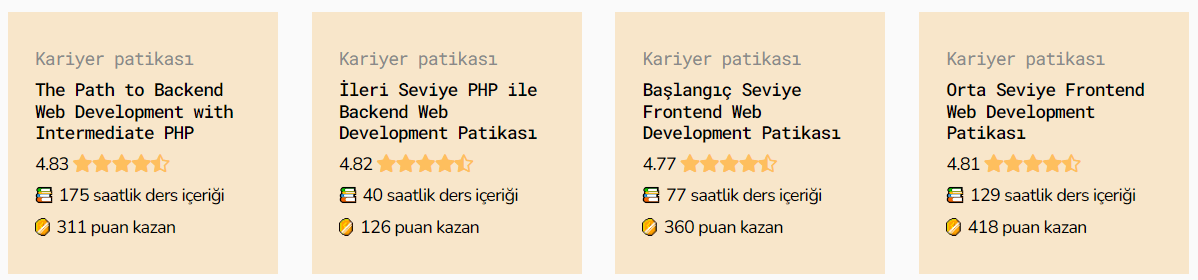 İçerikler, türkçe kaynak sorununu çözecek, yazılıma başlamak isteyen herkesi kapsayacak şekilde sadece teorik değil, alıştırma ve projelerle de desteklenerek Türkiye’nin deneyimli yazılımcıları ve uluslararası partnerlerimizle oluşturuldu. İçerikler, kullanıcılar tarafından oylanabiliyor ve yorumlar bırakılabiliyor. İşte patikaların puanları: