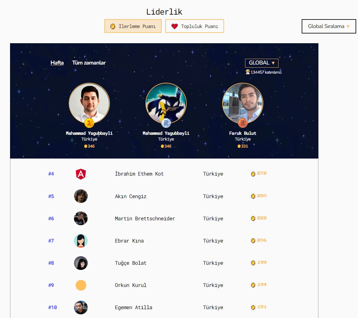 Liderlik tablosundaki diğer oyunlaştırmaysa topluluk puanı. Topluluk puanı kişilerin platformda öğrenen diğer kişilerle ne kadar bağlantı kurarsa, kendi profilini ne kadar canlı tutarsa o kadar puan topladıkları yer. Arkadaşlarını davet ettiklerinde, bir kullanıcıya teşekkür ettiklerinde, bir kullanıcının projesini değerlendirdiklerinde, yorumları beğendiklerinde ya da profillerini doldurduklarında topluluk puanı kazanıyor ve haftalık değişen en’ler tablosunda yerini alıyor. Burada da amaç, öğrenen kişilerin birbirleriyle etkileşim haline girmesini ve birbirlerine destek olmasını sağlamak ve öğrenmeyi eğlenceli hale getirmek.