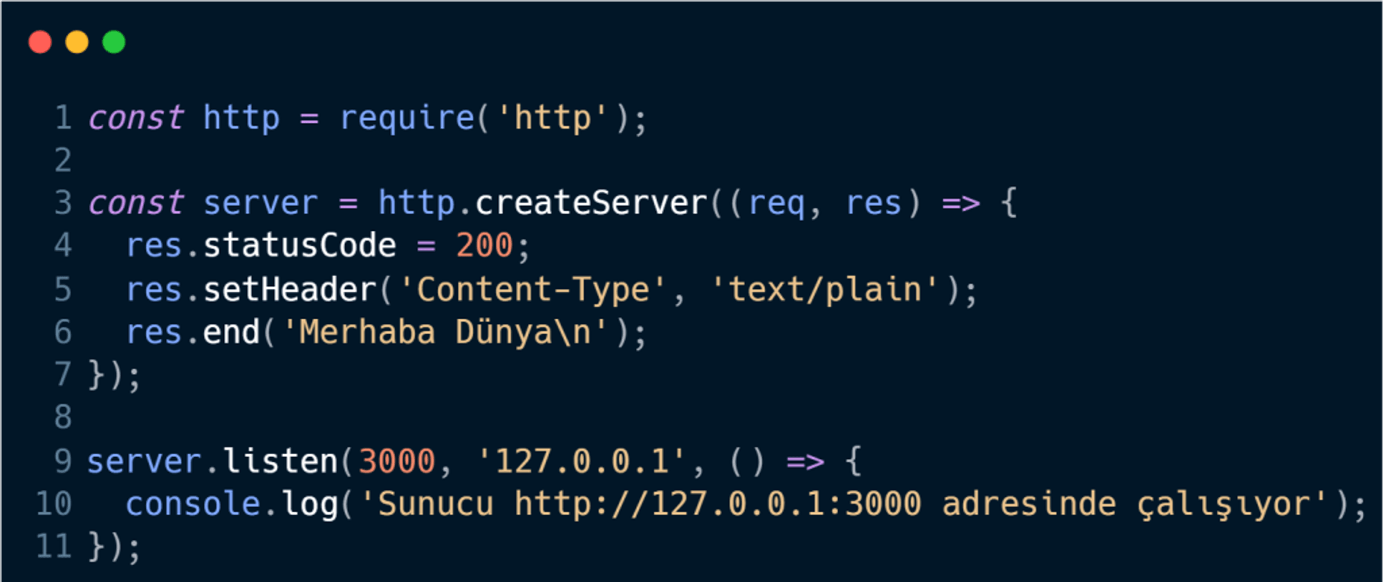 Bu basit kod parçası, Node.js kullanarak bir web sunucusu oluşturur ve tarayıcıda 'http://127.0.0.1:3000' adresine gidildiğinde "Merhaba Dünya" mesajını döner. Bu örnek, Node.js'in esnek ve güçlü yapısını basitçe gösterir.