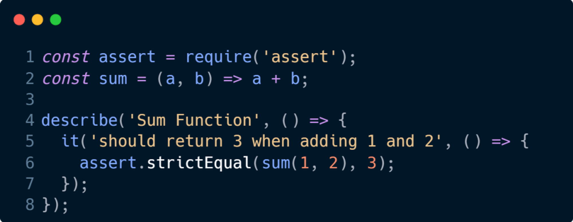 Bu örnekte, assert modülünü kullanarak sum fonksiyonunun doğru çalışıp çalışmadığını test ediyoruz. describe ve it blokları, testleri gruplamak ve açıklayıcı hale getirmek için kullanılır. Bu yapı, testlerin organizasyonunu kolaylaştırır ve okunabilirliği artırır.