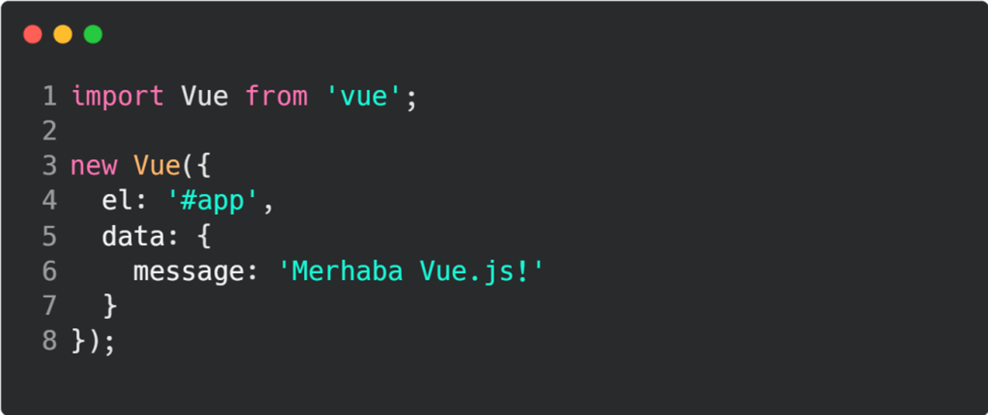 Yukarıdaki örnekte, Vue.js'yi import ederek Vue uygulamamızı oluşturduk ve HTML dosyamızda #app id'sine sahip bir eleman üzerinde çalışmasını sağladık.