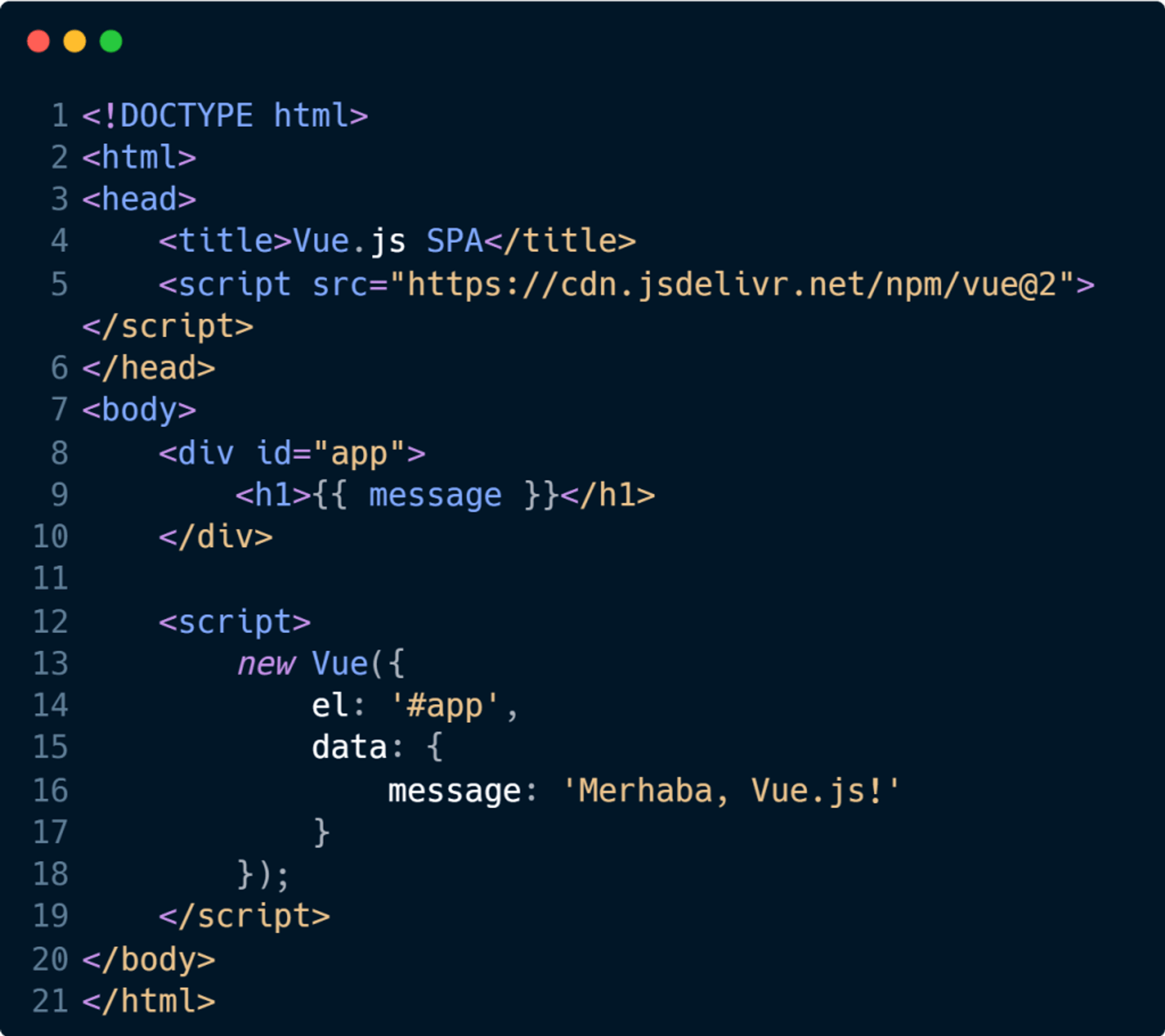 Bu kod, Vue.js'nin en son sürümünü projenize ekleyecektir. Daha sonra, Vue.js uygulamanızı tanımlayabilirsiniz: