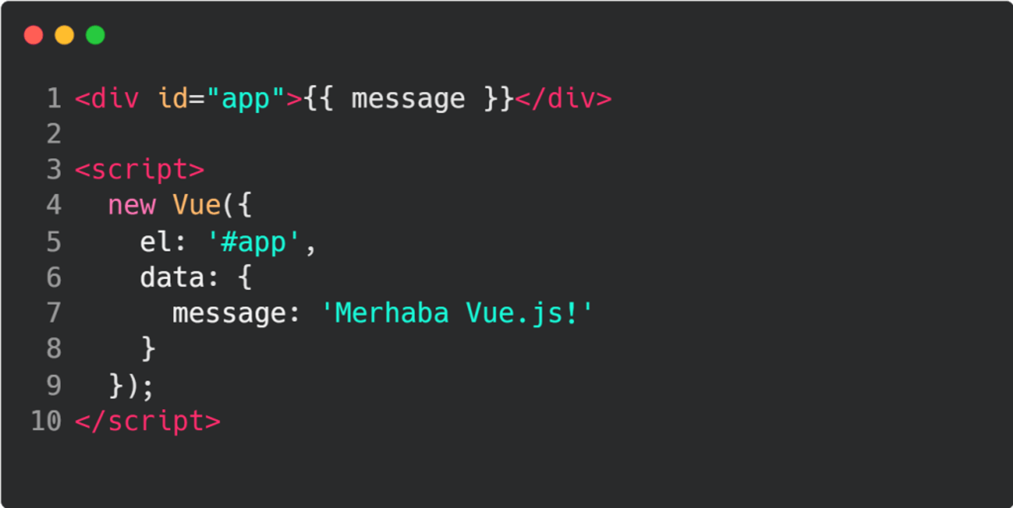 Yukarıdaki örnekte, #app id'sine sahip bir div elemanı tanımladık ve bu elemanın içinde message adında bir veri bağlama kullandık. Vue.js uygulamamızda, message verisini tanımlayarak bu değerin HTML içinde görüntülenmesini sağladık.