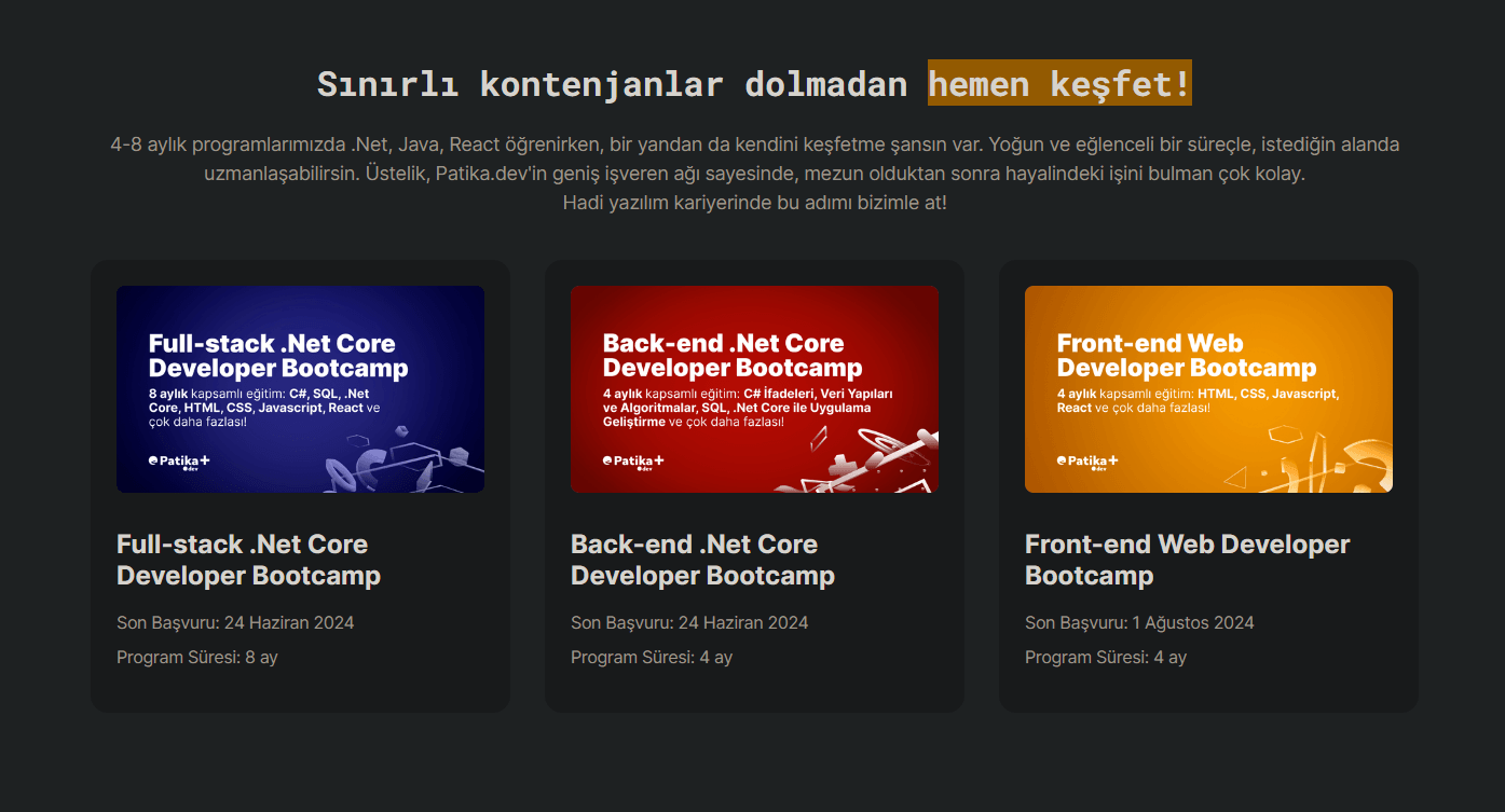 Yazılım mühendisliği alanında kendinizi geliştirmek ve sektördeki yeniliklere ayak uydurmak istiyorsanız, Patika.dev'in Patika+ (Patika Plus) programları tam size göre! Patika.dev, yazılım geliştirme konusunda uzmanlaşmanızı sağlayacak interaktif eğitimler ve projeler sunar. Patika Plus programı ise, daha fazla detaylı eğitim ve mentorluk desteği ile yeteneklerinizi bir üst seviyeye taşımanıza yardımcı olur. Hem ücretsiz hem de ücretli seçenekleriyle geniş bir eğitim yelpazesi sunan bu platformlar, yazılım mühendisliği kariyerinizi şekillendirirken size büyük avantajlar sağlar. Detaylı bilgi ve kayıt için Patika.dev sayfasını ziyaret edebilirsiniz.